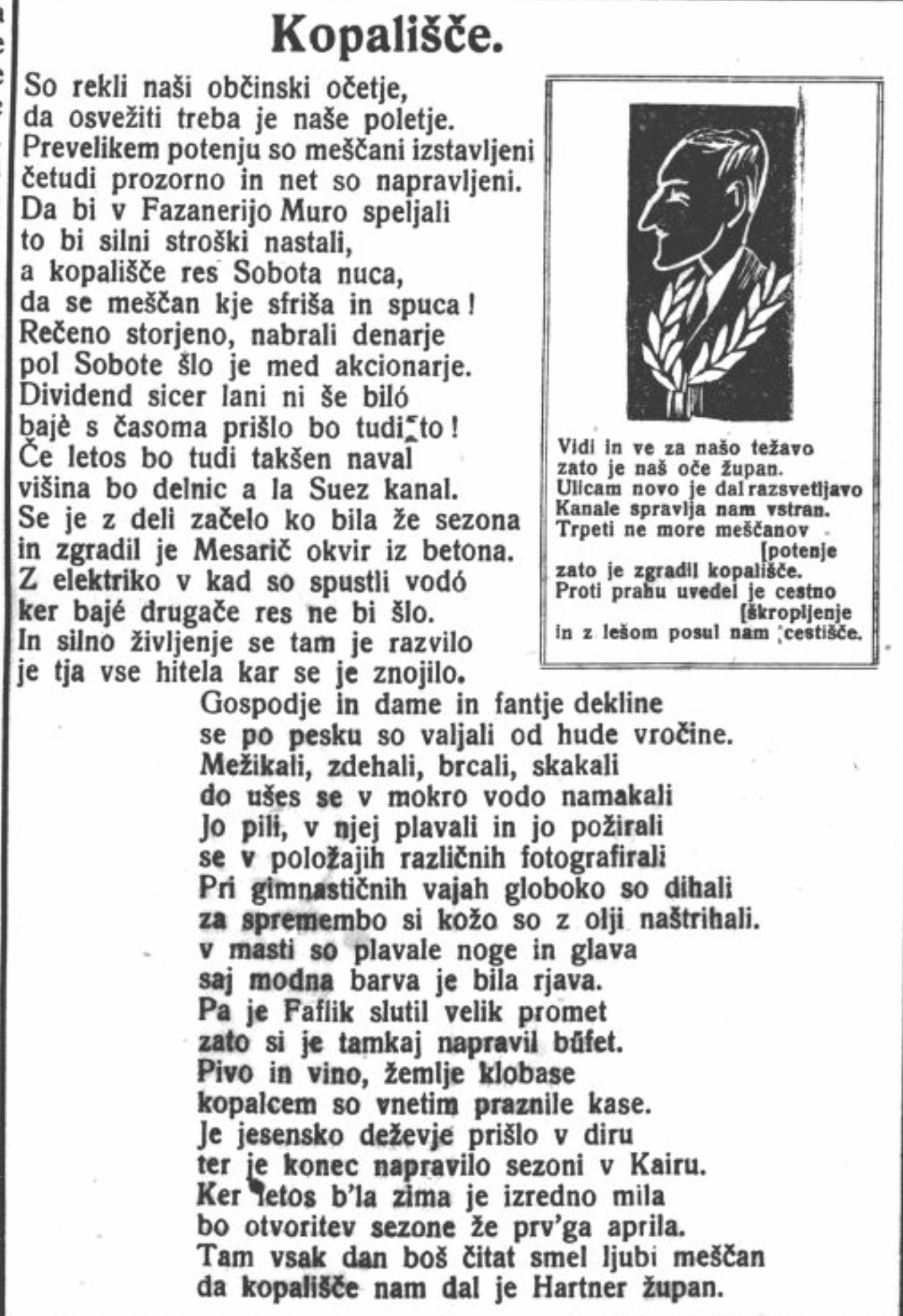 Eden takih je članek »Kopališče«, ki na zbadljiv način prikazuje takrat novo murskosoboško kopališče, pri čemer smeši tako lokalno oblast kot tudi lokalno prebivalstvo. Zgrajena sta bila dva bazena, en za odrasle, drug za otroke. Odprli so ju leta 1935 na območju Fazanarije, kjer sta v uporabi še danes (t. im. stari bazen in otroški bazen sta letos torej dopolnila 90 let). V članku se norčujejo iz razloga po potrebi nujne gradnje kopališča, nuja pa naj bi izhajala iz prevelikega potenja meščanov. Norčujejo se tudi iz prevelikih pričakovanj po donosih tistih Murskosobočanov, ki so vložili finančna sredstva v izgradnjo kopališča; ti naj bi bili enaki donosom Sueškega prekopa. Kot uporabniki kopališča so navedeni »gospodje in dame in fantje dekline«, torej višji sloj in mladina. Njihovo preživljanje prostega časa v kopališču je prav tako opisano na satiričen, zbadljiv način. V članku so navedeni še trije priimki: Mesarič, Faflik in Hartner. Štefan Mesarič je bil lokalno znani gradbeni mojster, Alojz Faflik je bil lastnik gostinskega lokala v Murski Soboti, Ferdinand Hartner pa je bil med leti 1933 in 1945 župan Murske Sobote. Za slednjega je ob članku tudi njegova podoba, pod njo pa še satirična vsebina o njegovih županskih ukrepih. Sodeč po njej je Murska Sobota dobila kopališče zato, ker njen župan ni prenašal potenja meščanov.
