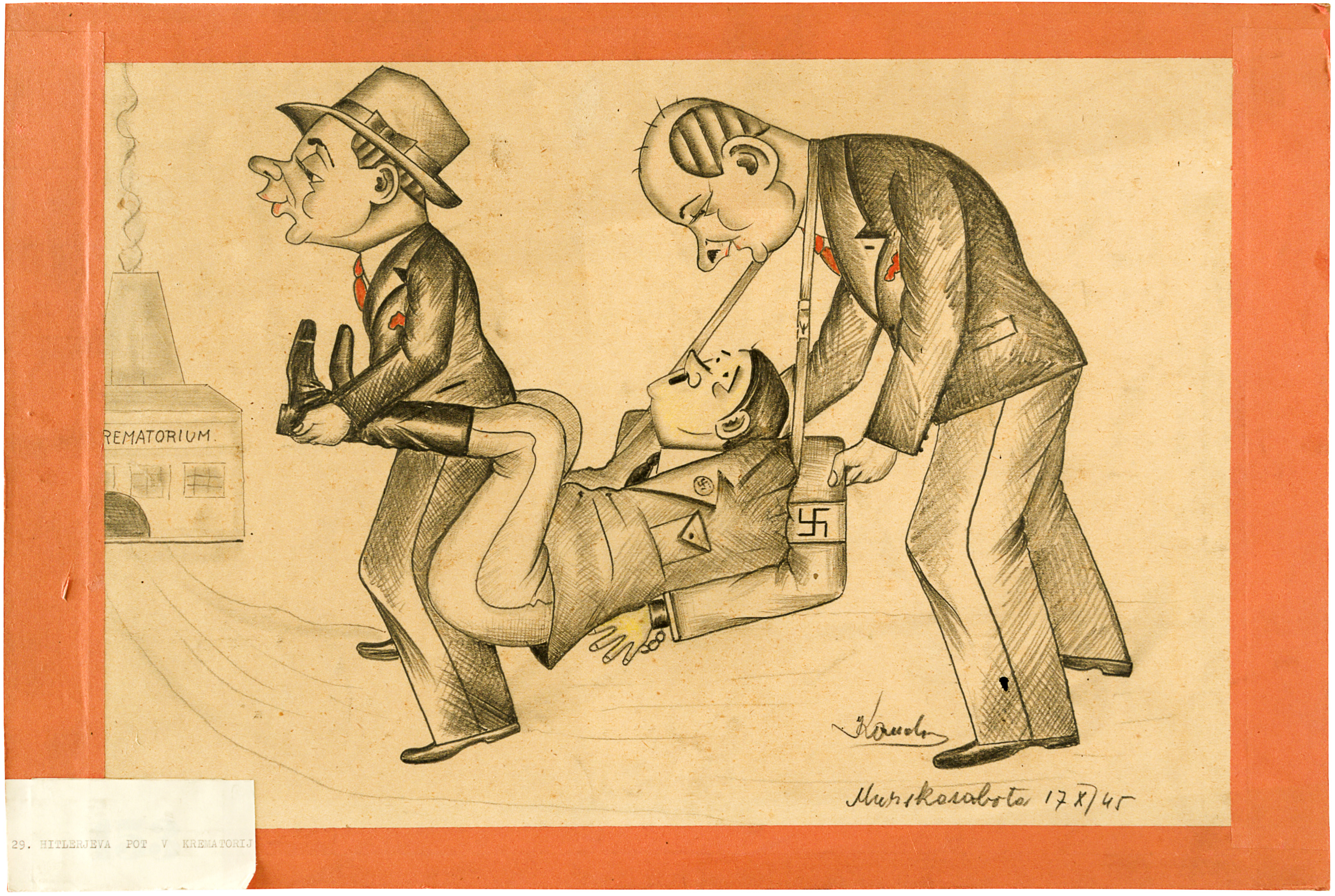 Soboški karikaturist samouk Ladislav Kondor je kot svetovni popotnik prepotoval 36 držav po celem svetu in na svojih postojankah risal pretežno portretne karikature oz. smešne portrete. Nekaj risb pa na karikiran oz. šaljiv način prikazuje aktualno dogajanje, ki ga je umetnik tako želel komentirati. Oktobra leta 1945 je bila druga svetovna vojna končana, Adolf Hitler je bil mrtev, se je pa širila vest o grozodejstvih, ki so se vršila v številnih koncentracijskih taboriščih. Karikaturist se je upodobil skupaj s prekmurskim pisateljem in političnim aktivistom Miškom Kranjcem, oba portreta sta karikaturi. Mirno neseta prestrašenega slabiča v verigah, ki se s strahom ozira v Kondorjeve oči, proti krematoriju v ozadju risbe. Brčice, čez teme počesani lasje in uniforma s kljukastim križem razodevajo Hitlerja, ki mu je namenjena usoda milijonov pobitih v plinskih celicah in sežganih v pečeh krematorija. Miško Kranjec spredaj in Kondor zadaj, ki ima Hitlerja oprtanega okoli vratu, delujeta sproščena, kot da se zabavata, poudarjene so njune rdeče obarvane ustnice, kravati in robčka v žepu suknjiča. Ta barvni odtenek izpostavlja, da je socializem s komunizmom premagal črno tiranijo nacionalsocializma. Težko, travmatično in tragično temo je Kondor predstavil v podobi risbe, ki na prvi pogled vzbuja komiko, v podrobnostih pa izpričuje čutenje in razmislek številnih, ki so dočakali mir.