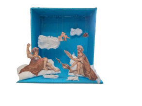 V baročnem salonu murskosoboškega gradu si bomo najprej ogledali zanimivo poslikavo stropa, na katerem so na nebu naslikani bogovi iz antične mitologije, ki jih obdajajo majhni krilati otroci. Spoznali bomo njen pomen, nato pa izdelali dioramo. Udeleženci boste prejeli modro škatlo, v katero boste umeščali motive iz stropne poslikave, ki bodo z malo domišljije zaživeli.