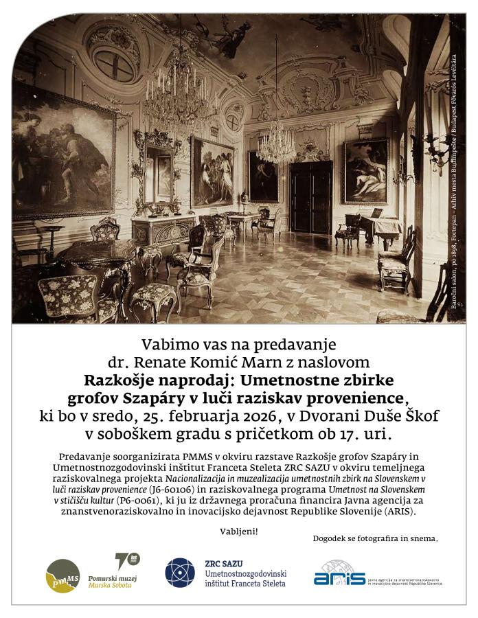 Predavanje soorganizirata PMMS v okviru razstave Razkošje grofov Szapáry in Umetnostnozgodovinski inštitut Franceta Steleta ZRC SAZU v okviru temeljnega raziskovalnega projekta Nacionalizacija in muzealizacija umetnostnih zbirk na Slovenskem v luči raziskav provenience (J6-60106) in raziskovalnega programa Umetnost na Slovenskem v stičišču kultur (P6-0061), ki ju iz državnega proračuna financira Javna agencija za znanstvenoraziskovalno in inovacijsko dejavnost Republike Slovenije (ARIS).