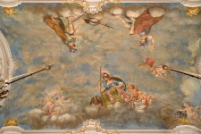 From the once richly furnished castle in Murska Sobota, the great hall/drawing room has retained most of its former splendour. On the ceiling, there is a holistically painted, iconographically alluring realisation of the allegory of peace in the manner of Baroque illusionism of the later period. Just as remarkable are the three paintings of Italian origin: Christ Healing a Man with Dropsy (c. 1600) in the style of Late Mannerism, and the depiction of Nicolo Bambini's (1651-1736) Jacob Wrestling with the Angel and Judas and Tamara. The current furnishings of the salon consist of an early Baroque chest of drawers (Reggio-Emilia, 17th century), an inlaid floor clock with a clockwork mechanism by Frantz Schindler (c. 1780) and a New Baroque, historic seating set from the third quarter of the 19th century. The salon table in the style of Louis XVI is extremely valuable with an artfully crafted plate and flower-painted porcelain inserts (Pierre Joseph Guerou, 1852).