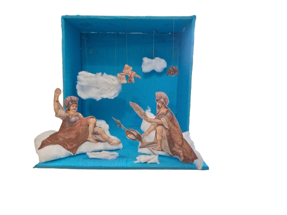 V baročnem salonu murskosoboškega gradu si bomo najprej ogledali zanimivo poslikavo stropa, na katerem so na nebu naslikani bogovi iz antične mitologije, ki jih obdajajo majhni krilati otroci. Spoznali bomo njen pomen, nato pa izdelali dioramo. Udeleženci boste prejeli modro škatlo, v katero boste umeščali motive iz stropne poslikave, ki bodo z malo domišljije zaživeli.