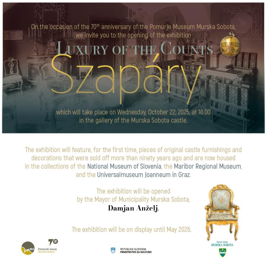 The opening of the main exhibition marking the 70th anniversary of the Pomurje Museum Murska Sobota will take place on Wednesday, October 22, 2025, at 18,00. For the first time in more than ninety years, the exhibition will feature pieces of furniture and decorations that adorned the quarters of the noble family Szapáry, the last aristocratic owners of this castle, on display at the Murska Sobota Castle. They are coming to their former home on loan from the collections of the National Museum of Slovenia, the Maribor Regional Museum, and the Historical Museum of the Universal Museum Joanneum in Graz.