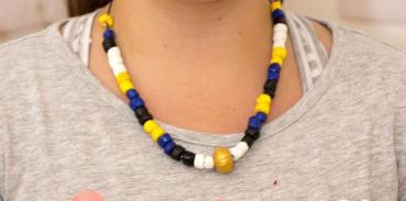 Med najdragocenejšimi najdbami iz slovanskega grobišča Plese iz zgodnjega srednjega veka so štiri ogrlice iz steklenih jagod, ki so bile najdene v grobovih ene odrasle ženske in treh deklet. Ogrlice so bile uvožene in dragocene, zato so si jih lahko privoščili le v bogatejših družinah. Učenci na delavnici po navdihu teh ogrlic ustvarijo svojo ogrlico, tako da pobarvajo perlice iz mase za oblikovanje in jih nanizajo v ogrlico.